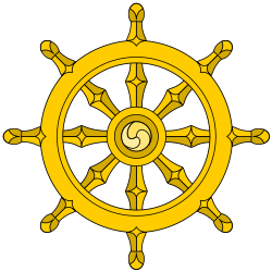 Rueda del dharma: es el símbolo característico del budismo. Este puede rastrearse hasta el gobierno del rey Ashoka, entre el 304 a. C. y el 232 a. C. El símbolo muestra un círculo que representa el chakra y lo perfecto de la enseñanza del dharma. El centro representa la disciplina y resulta útil para la meditación. El círculo que sostiene los radios que salen del centro representan la consciencia que los budistas tienen sobre todas las cosas. Este símbolo puede encontrarse en el centro de la bandera de la India.